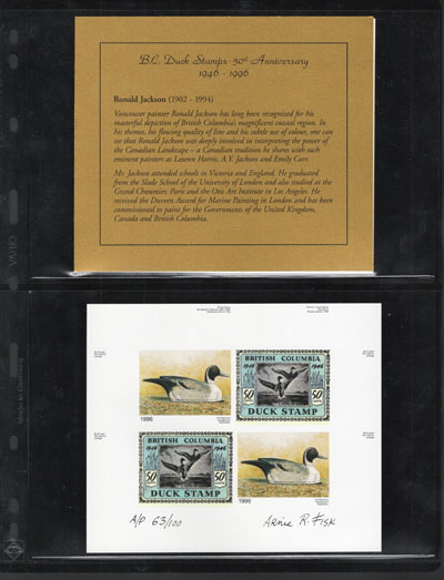 Group of British Columbia Conservation Revenues, consisting of BC Waterfowl and Chinook Conservation stamp booklets, including the 1989-1990 Chinook Salmon booklets containing panes of one (1 x the regular booklet #BCF1A, 2 x Artist Signed "R. Field" #BCFAs), and a group 1996-1997 Pitt Waterfowl Management Association booklets (3 x #PW7, 2 x imperforate Artist Signed "Arnie Fisk" #PW7b, 2 x #PW8, 1 x imperforate Artist Signed "Arnie Fisk" #PW8b). The early Salmon booklets are particularly hard to find. 2022 van Dam $550. (Image)