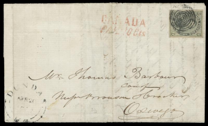 #2 6d Consort, four full margins ties by target cancel on folded letter from Dundas, UC (AP 20 1852) to Oswega, NY, USA with treaty handstamp "CANADA / PAID 10 Cts", VF. All images shown available as PDF. Click here for PDF.(Image)