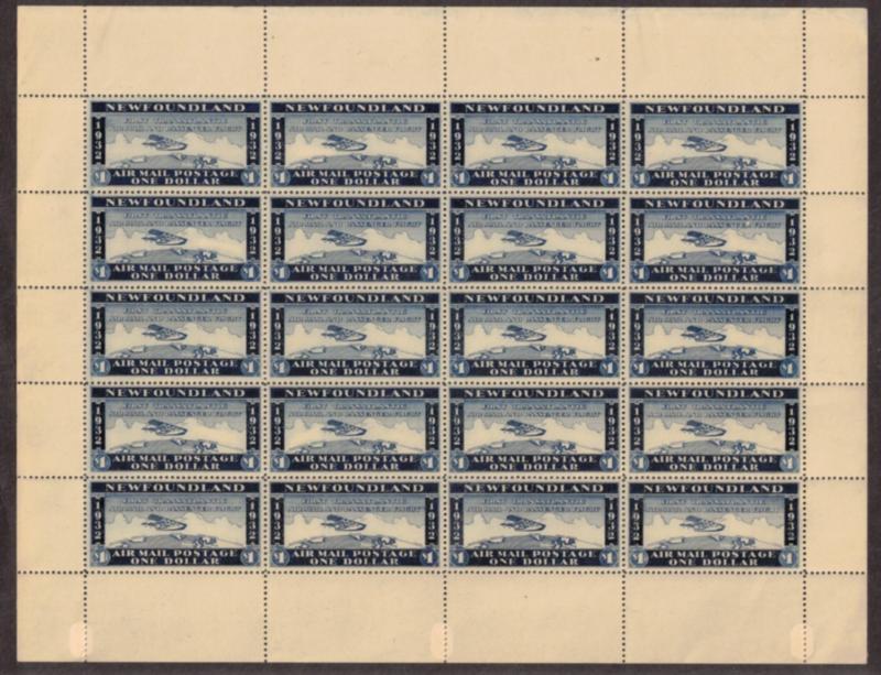 Canada - Newfoundland Unissued Private Airmail Full Sheet of 20 - "Wayzata" airmail (1932), never officially issued. Sheet is MNH but has some overall gum disturbance likely from previously mounting. Generally F-VF to VF centering. (SCV $700 as singles) (Image)