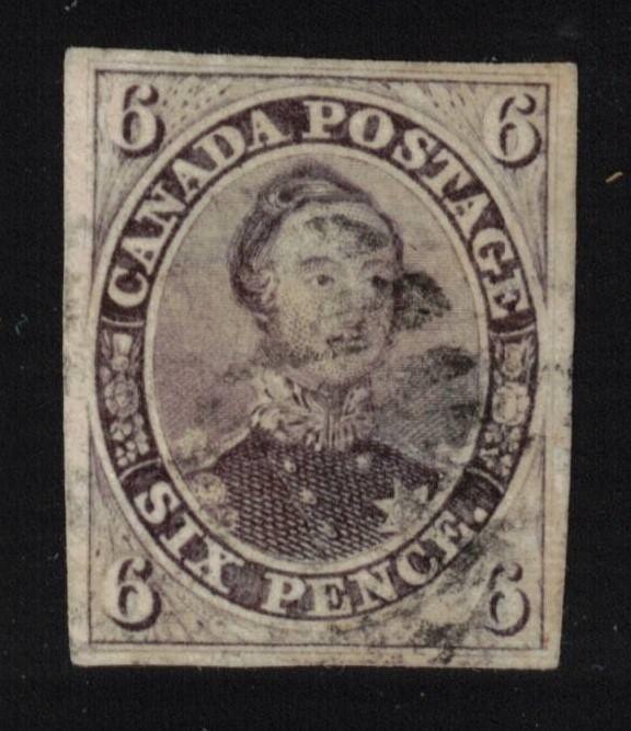 Canada Scott 10 Used, 1857 6¢ Reddish Purple, Thick Soft Paper with 2013 Greene Cert - Deep rich color with generous margins all around. Greene certificate states "used, thick soft paper, genuine, slight thin." Lovely stamp! (SCV $6750) (Image)