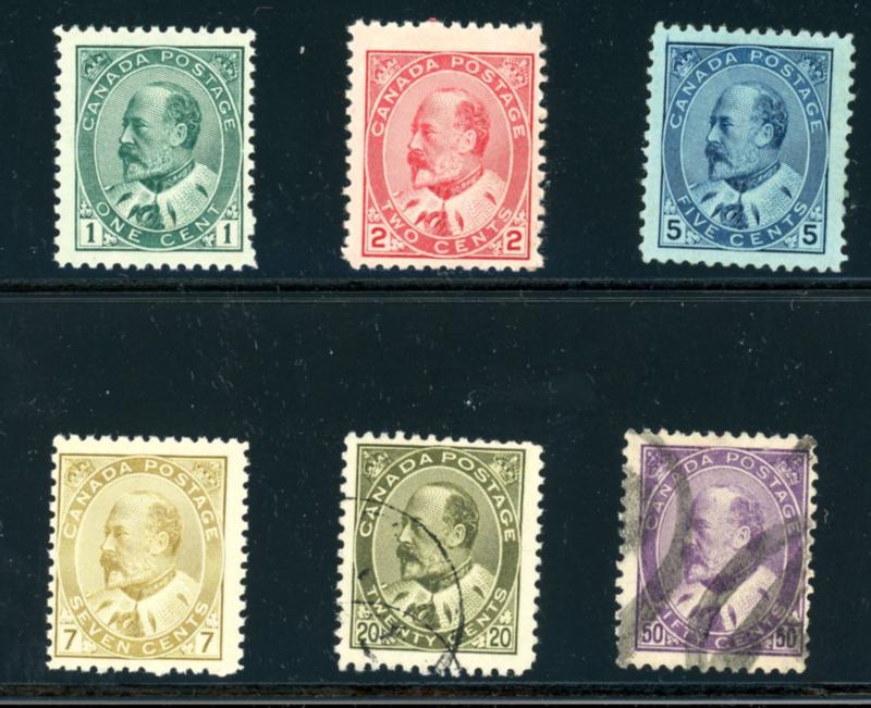 Canada King Edward VII Selection - 6 different stamps includes Scott 89-90 MNH, 91 MH, 92 MNH, and 94-5 used. All are sound. Centering varies from fine to VF. (SCV $2072) (Image)