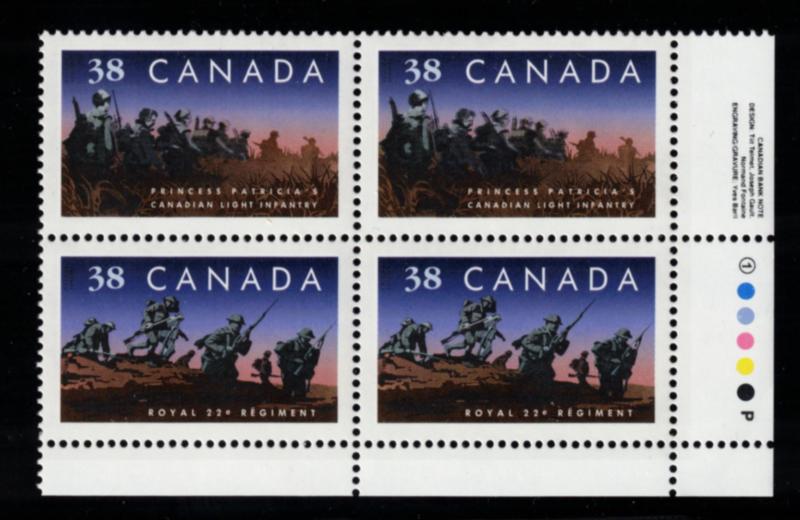 Canada Scott 1250ii MNH Inscription Block - 1989 Canadian Infantry Regiments issue. Less than 50 full panes exist with imprints. Light bend LR corner. Otherwise VF. (UTC $250) (Image)