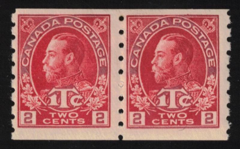 Canada Group of King George V Coil Pairs, MNH, MH, Used, Paste-Ups - Excellent group of 30 coil pairs, mostly hand chosen for appearance. MNH includes Scott 126, 127i paste up, 127iii rose red, 128, 129, 131, 131 strip/4 with paste-up pair in center, 134, 136, 138, 160i paste-up, 161, 178 (x2), 179 (x2), 180 (x3), 181, 182, 183, 183 line pair; MH include Scott 129 starter strip, 131, 137, 182; Used Scott 123, 129i paste-up. Also included is KEVII Scott 90A MNH imperf pair. Excellent lot to set up for retail or internet. High catalog value. Appears fault free and generally fine or better with several VF appearing pairs. (Est $400-500) (Image)