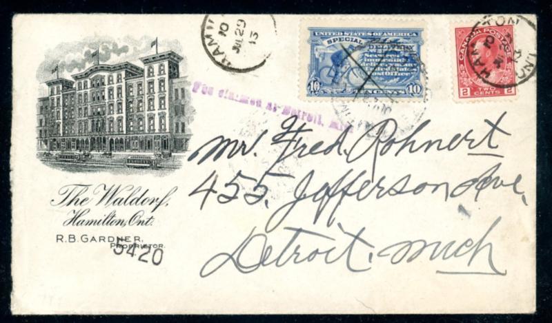 Canada Scott 106, USA Scott E8 on 1913 Advertising Cover - 2¢ Admiral on Hamilton Ontario "Walforf Hotel" advertising cover with USA 10¢ special delivery affixed in Canada pre-paying as per regulations. Admiral stamp tied by "HAMILTON JUL 29 / 13" CDS. "Fee Claimed at Detroit Mich" handstamp and Detroit receiving cancel on back. Cover opened at left. F-VF condition. (Est $150-200) (Image)
