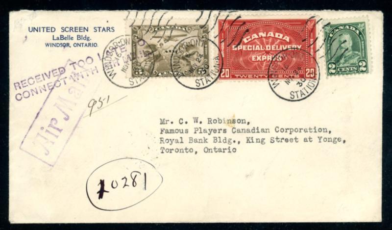 Canada Scott 164, C1, E4 on 1930 Special Delivery Cover -"TWENTY CENTS" special delivery issue, 2¢ dull green, 5¢ airmail all tied to "United Screen Stars" cover with "WINDSOR ONT NOV 24 / 30 duplex to Toronto. "RECEIVED TOO LATE TO/CONNECT TO AIRMAIL" handstamp in purple at upper left. VF and neatly opened at top. (Est $90-120) (Image)