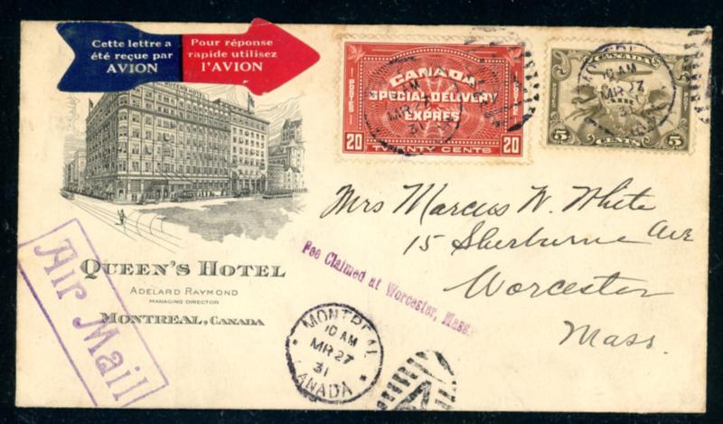 Canada Scott C1, E4 on 1931 Airmail Advertising Cover "TWENTY CENTS" special delivery issue, and 5¢ airmail tied to Registered Airmail "QUEEN'S HOTEL MONTREAL" illustrated cover to USA by "MONTREAL MR 27 / 31 duplex cancels. Early "par Avion" French airmail label affixed. Backflap tear otherwise F-VF. (Est $90-120) (Image)