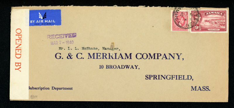 7 MARCH 1940 / Kingston, Jamaica, to Springfield, Massachusetts. Franked with 1d (SG 122) and 9d (SG 129), tied by double-circle ‘KINGSTON / JAMAICA’ cds. The cover bears a characteristic Jamaican censor label ‘OPENED BY CENSOR’ confirming local censorship, despite lacking code letter or number. Such unnumbered Jamaican censorship is scarcer, offering an appealing variation in the study of British Caribbean wartime censorship. Fine to Very Fine. Est $40-$50 (Image)