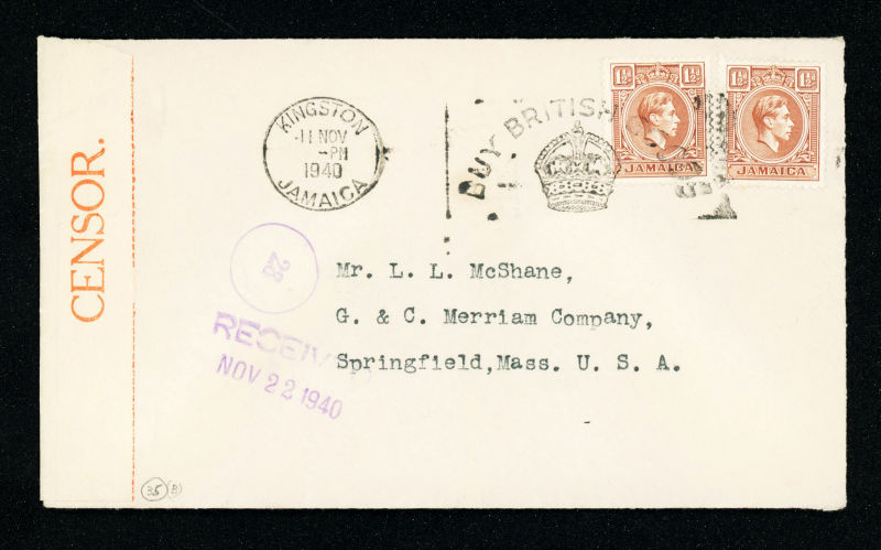11 NOVEMBER 1940 / Kingston, Jamaica, to Springfield, Massachusetts. Censored in Jamaica with a typical local ‘OPENED BY CENSOR’ label. This cover also bears a bold patriotic handstamp ‘BUY BRITISH GOODS’ with crown motif tying a pair of 1½d (SG 123). Additional markings include purple circular ‘28’ and purple ‘RECEIVED NOV 22 1940’ handstamps.