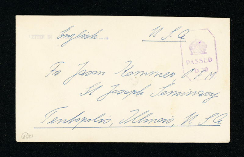 17 MARCH 1943 / Jamaica to Teutopolis, Illinois. Stampless Prisoner of War cover with purple octagonal, crown, ‘PASSED D/39’ on front, indicating no further postal censorship required. Reverse shows purple oval ‘INTERNMENT A.P. of W. CAMP / 17 MAR 1943 / JAMAICA’ handstamp. ‘A.P. of W. CAMP’ refers to the Alien Prisoner of War Camp, one of Jamaica’s WWII internment facilities where enemy aliens and POWs were detained.