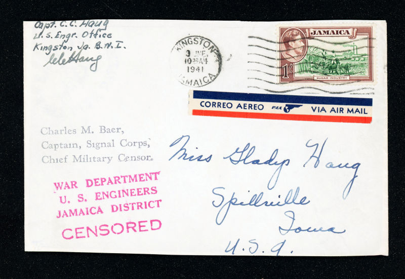 3 JUNE 1941 / Kingston, Jamaica, to Spillville, Iowa. Cover from the U.S. Army Engineer’s Jamaica District office, based at Vernam Field and Fort Simonds (Clarendon Parish). Struck with ‘Charles M. Baer / Captain / Signal Corps / Chief Military Censor’ and red ‘WAR DEPARTMENT / U.S. ENGINEERS / JAMAICA DISTRICT / CENSORED’ handstamp.