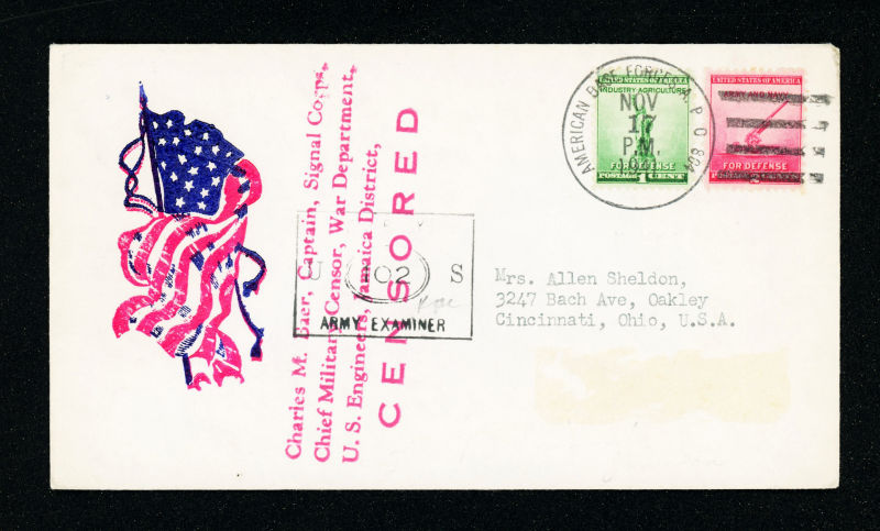 17 NOVEMBER 1941 / After the U.S. A.P.O. 804 opened at Vernam Field and Fort Simonds (Clarendon Parish) on 17 November 1941, it used only one type of datestamp during its operation. This U.S. 1c and 2c (SC 899 & 900) franked cover to Cincinnati, Ohio, bears both a black U.S. ‘102 / ARMY EXAMINER’ marking and a scarcer red circular ‘Charles M. Baer / Captain / Signal Corps / Chief Military Censor / War Department / U.S. Engineers / Jamaica District / CENSORED’ handstamp.