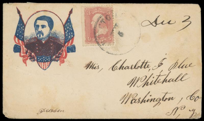 Gen. McClellan. Portrait in oval with flags, cannons and shield in red and blue, 3c rose (65) tied by indistinct cds (probably Washington DC), additional manuscript "Due 3" to Whitehall NY, Very Fine. Estimate; $100 - 150. US$100-150 (Image)
