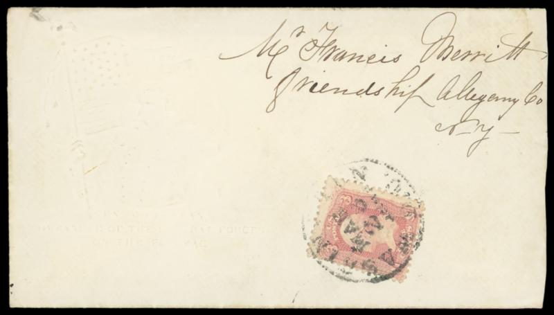 Gen McClellan, Commander of the Federal Forces on the Potomac. Blind embossed patriotic design showing McClellan with Flag on cover bearing 3¢ rose (65) tied by "Washington D.C., Mar 28, 1863" cds to Friendship N.Y., flaps red and blue edged; reduced slightly at right, Very Fine. Estimate; $100 - 150. US$100-150 (Image)