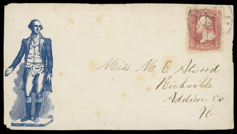 George Washington. Blue full body patriotic design on cover bearing 3¢ rose (65) tied by "Brattleboro, Vt. Oct 20" cds to Richville Vt.; small flaws, reduced at edges, Fine appearance. Bischel No. 93 var.; Estimate $100 - 150. US$100-150 (Image)