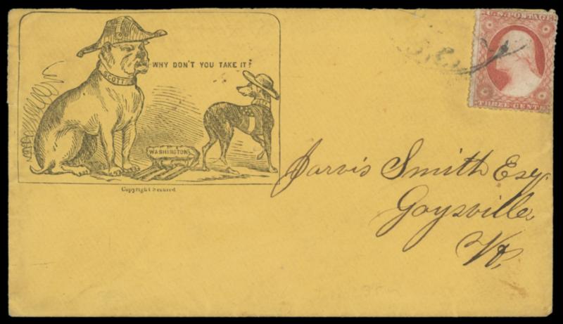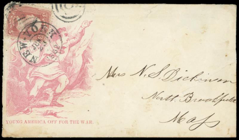 Col. Birney, Col. Baxter, Col. Gosline. Bicolor overall design with "Our Zouaves" imprint below oval portraits, on cover bearing faulty 3¢ rose (65) tied by "Washington, D.C., Dec 21, 1862" cds to Elymra N.Y.; minor edge faults, Very Fine appearance,ex-Bischel, Milgram. Bischel No. 812; Estimate $300 - 400. US$300-400 (Image)