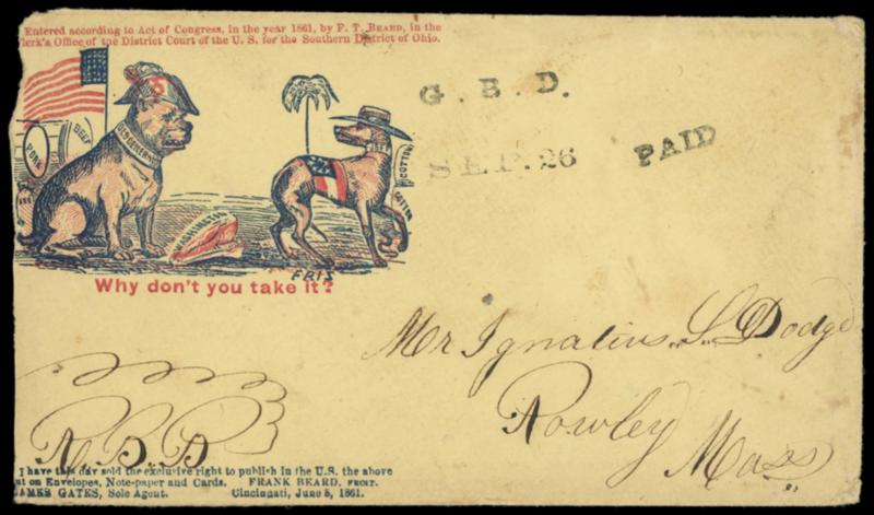 "The Loyal States Will Have No Compromise With Traitors, Treason and Treachery." . Red and blue soldier, flag and cannon patriotic design with Magee imprint at left on cover with manuscript soldier's endorsement, "Harrisburgh Pa. Oct 14, 1861" cds and boxed "Held for Postage" handstamp, second "Harrisburgh Pa. Oct 21, 1861" cds with matching "Due 3" oval handstamp to Dushore Pa.; some edge wear and soiling, F.-V.F. and uncommon Civil War patriotic design,ex-Milgram. Estimate; $150 - 200. US$150-200 (Image)