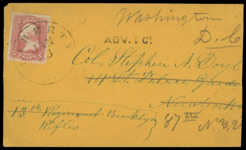 1862 (Jan. 23) Liberty N.Y. to New York City seeking Officer. Orange cover beainrg 3¢ rose (65) tied by "Liberty N.Y. Jan 23" cds to Col. Stephen A. Doyle, 13th Regiment Brooklyn Rifles, 14th St. Palace Gardens, New York City, sharp Advertised "ADV. 1 Ct." straightline, reverse with "Yorkville N.Y., Apr 2, 1862" cds and pencil "Not Called For", forwarded to 8th N.Y.V., Washington D.C.; back slit open, reduced at right, F.-V.F. Estimate; $50 - 75. US$50-75 (Image)
