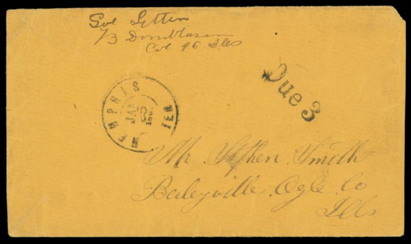 Memphis Ten. Jan 25, 186. Double-circle cds with matching "Due 3" rating on orange cover endorsed "Sol Letter, B., Col 46 Ills." addressed to Baleyville Ills.; reduced sligthtly at right, F.-V.F. Tennessee Soldier's Letter,ex-Gallagher. Estimate; $50 - 75. US$50-75 (Image)