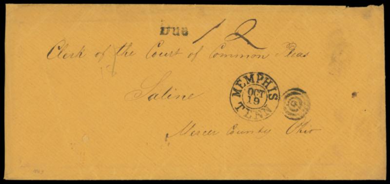 1863 (Oct. 19) Memphis, Tenn. to Saline, Ohio. Circa 1863 legal-size orange cover with bold "Memphis, Tenn. Oct 19" duplex and matching "Due" handstamp with ms. "12" rating for double-rate, doubled again for penalty (Act eff. July 1, 1863, Section 26) as no "Soldier's Letter" endorsement present, F.-V.F.,ex-Graham (photocopy of exhibit page). Estimate; $75 - 100.