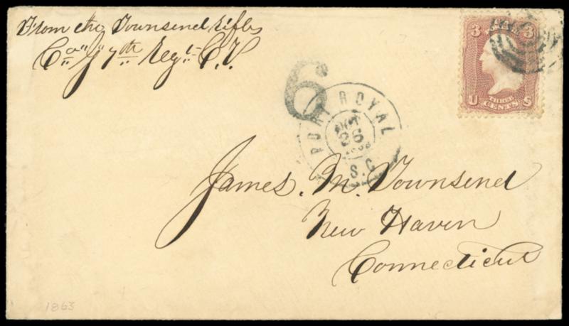 Port Royal, S.C. Oct 26, 1863. Occupation cds on cover with matching four-ring target cancel ties 3¢ rose (65), nicked at top, on buff cover to New Haven Conn., endorsed "From the Townsend Rifles, Co. G 7th. Regt. C.V." at top left, "6" cents due handstamp; flap torn, Very Fine use. Estimate; $75 - 100. US$75-100 (Image)