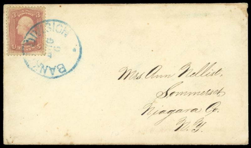 Banks Division, Aug 6. Neat blue cds ties 3¢ rose (65) on cover to Somerset N.Y.; reduced slightly at right, Very Fine field post use. Estimate; $75 - 100. US$75-100 (Image)