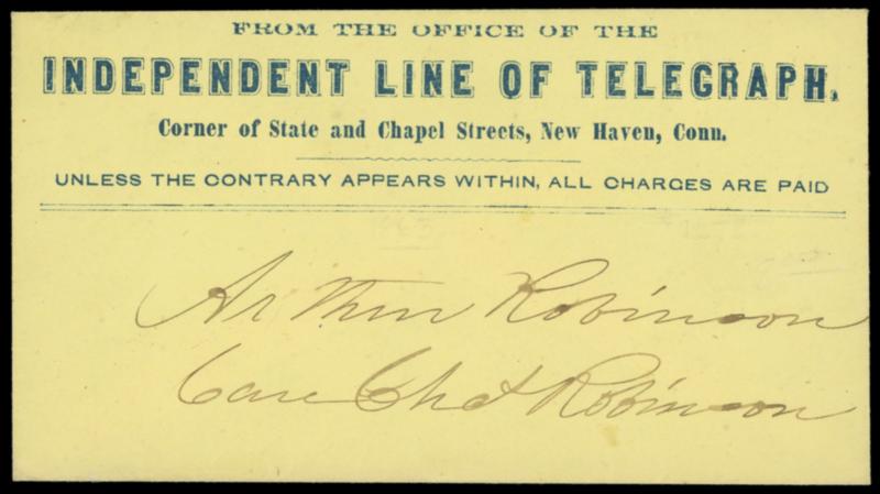 Independent Line of Telegraph, New Haven Conn. Blue imprint on yellow cover with original Feb. 16th 1863 telegraph from New York City with "Come down by next train if possible, Telegraph answer" message to Arthur Robinson, fresh and Very Fine. Estimate; $100 - 150. US$100-150 (Image)