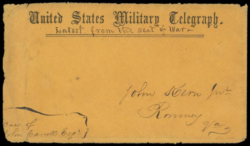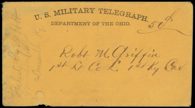 U.S. Military Telegraph, Department of the Ohio. Circa Feb. 1862 orange imprint cover with "50¢" rating addressed to Robt. M. Griffin, 1st Lt. Co. L., 1st Ky Cav., pencil "Filed by AHH, Louisville Ky." at left, F.-V.F.,ex-Kramer. Estimate; $100 - 150.