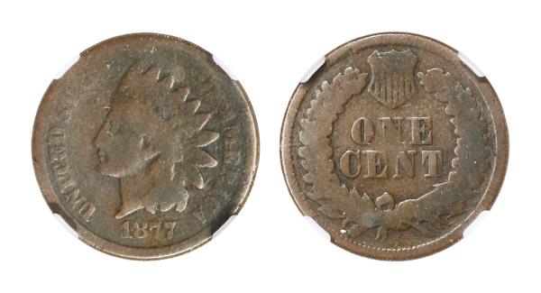 1877, 1C Indian Head Cent, NGC AG3 BN, famous key date, NGC graded About Good 3. (Image)