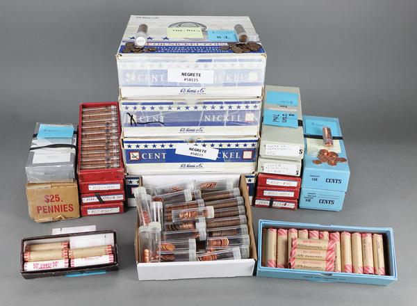 Assortment of Lincoln Small Cents Including Wheat Cents and Lincoln Pennies, 1910-2010s, tubes full of Lincoln wheat cents ranging from 1910-1958 (approximately $80+ face value, 80+ tubes); some better dates throughout; rolls and tubes of Lincoln memorial cents from 1959 through the 2010s; plenty of uncircualted rolls throughout; face value of approximately $275. Shipping charges apply - weight 190 lbs. (Image)