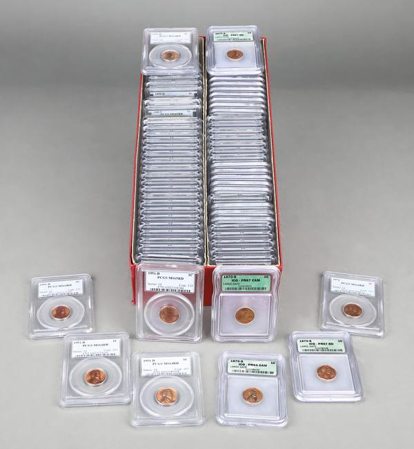 Collection of Graded Cents, 1937-1972, total of 69 graded cents in various grades; mainly uncirculated & some proof; grading companies include PCGS, ICG, & ANACS; greysheet of $596; inventory of lot on a spreadsheet attached. Shipping charges apply - weight 7 lbs. (Image)