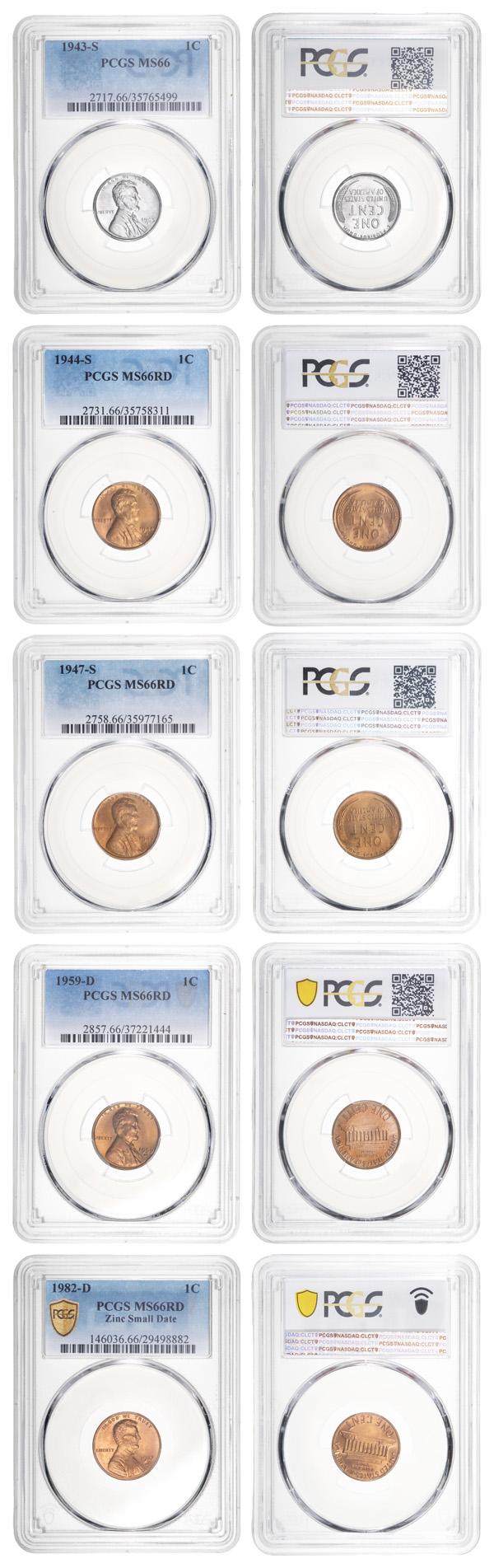 Group Of (5) PCGS Graded 1C Lincoln Cents/Pennies, 1943-1982, consists of: a 1943-S Lincoln Steel Penny PCGS MS66, a 1944-S PCGS MS66 RD, a 1947-S PCGS MS66 RD, 1959-D PCGS MS66 RD, & a 1982-D PCGS MS66 RD Zinc Small Date (5 coins total). Shipping charges apply - weight 1 lbs. (Image)