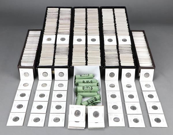 U.S. Mercury and Rooselvelt Dime Collection, 1916-1964, outstanding collection of over 200 coins featuring an useful assortment of Mercury dimes, with many Choice AU coins and some Uncirculated, no major key coins, but possibly a surprise or two; unsearched other than a quick evaluation; Roosevelt dimes offer a number of uncirculated examples that should be evaluated closely; silver melt alone is over $450 for the entire group not taking into account any numismatic items that may be present (200+ coins). Shipping charges apply - weight 5 lbs. (Image)