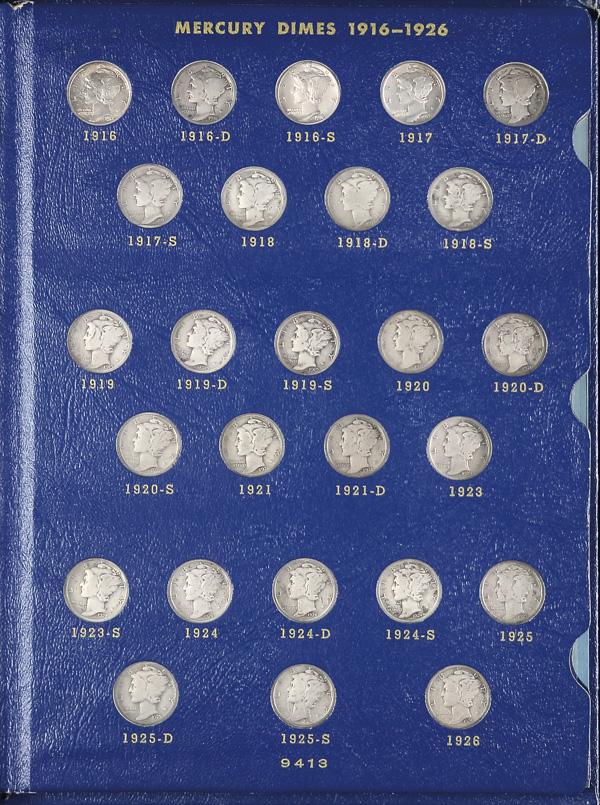 Group of 1916-1945 Mercury Dimes & 1946-1972 Roosevelt Dimes In Whitman Folders, 1916-1972, Mercury Dime album is complete minus the 1916-D date, all coins are 90% silver, the better dates include: 1921, 1921-D, 1926-S, 1931-D, 1942/41, & 1942/41-D; condition ranges from VG-AU; the Roosevelt Dime album is complete up to 1972, the dimes are silver up to 1964, condition ranges from VF-AU; inspect for yourself, some potential hidden gems. Shipping charges apply - weight 3 lbs. (Video for this lot) (Video2 for this lot) (Image)