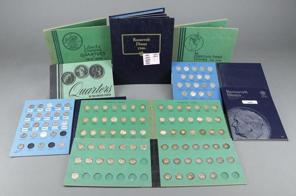 U.S. Barber, Mercury, & Roosevelt Dimes, Standing Liberty & Washington Quarters Collection 1902 to 2007, lot of 9 coin books made up of Wayte Raymond, Meghrig, and, Whitman coin books; highlighted by 23 different Standing Liberty quarters including a 1919 and 1924 in Choice XF to Uncirculated condition; the balance in VG to almost XF; an almost complete run of circulated Mercury dimes, missing the 1916-D 7 S, 1921-D, 1938-S, and 1942 over 1, condition ranges from VG to AU condition; Roosevelt dimes are complete in circulated and a large number in uncirculated condition with the proof issues beginning in 1970.; total 90% silver face value is $$25.80; worthy of a thorough examination (Over 400 Coins). Shipping charges apply - weight 6 lbs. (Image)