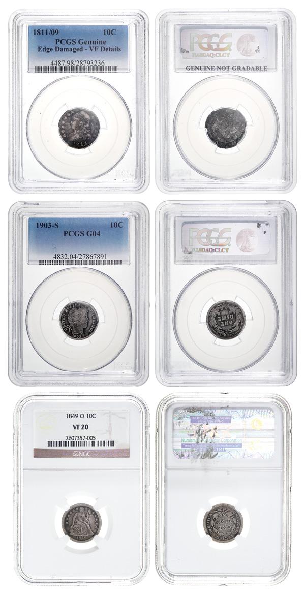 U.S. Dime Trio, 1811-1903, lot of 3 dimes, includes an 1811/09 Bust dime, PCGS VF Details with note of Edge Damaged and Genuine; 1849-O, Seated Liberty Dimes. NGC VF 20; and 1903-S Bartber Dime, PCGS G 4, useful dime group (3). Shipping charges apply - weight 1 lbs. (Image)