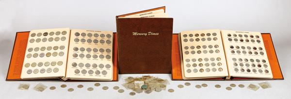 U.S. Mercury & Roosevelt Dime Collection, 1916-1979, lot of 3 Whitman albums with Mercury and Roosevelt dimes; there is a total of over 170 dimes of 90% silver, the Mercury Dime book is almost complete but missing 6 key coins, condition varies between good to AU or better; please examine; Roosevelt dimes include 2 complete date runs from 1946 to 1978 or 1979; a number of Uncirculated coins are included; total face value or 90% silver is $17 (3 albums with 170+ 90% silver dimes). Shipping charges apply - weight 2 lbs. (Image)
