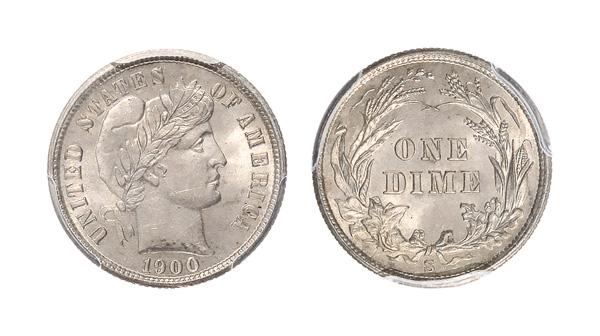 1900-S, Barber Dime 10C, PCGS MS64 CAC, from the D. L. Hansen Collection, PCGS graded Mint State 64. CAC. (Image)