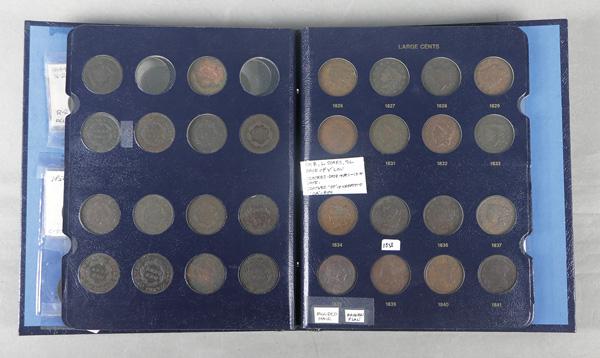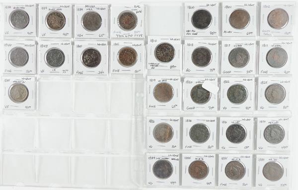 U.S. Large Cent Collection, 1800-1855, collection includes a total of 28 large cents in varying conditions, with a notable amount of fine and very fine examples; includes: 1835 in fine condition, 1825 in very good condition, 1817 in fine condition, 1848 in very fine condition, and many others; please see photos online (28). Shipping charges apply - weight 1.2 lbs. (Image)