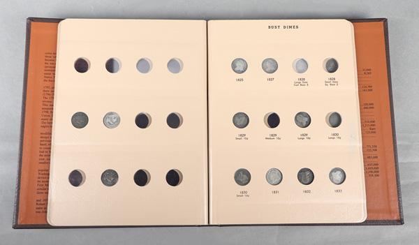 U.S. Bust Dime Collection, 1821-1837, features $2.10 in silver face value; housed in Dansco Albums; highlights include: 1821 Large Date in VG; 1823 - 3 over 2 in Choice VG; 1829 Small 10ct, Choice VG-Fine; 1830 and 1831, VF; and many other desirable coins that should be evaluated carefully with grades ranging from almost Good to VF. Shipping charges apply - weight 2 lbs. (PDF for this Lot) (Image)