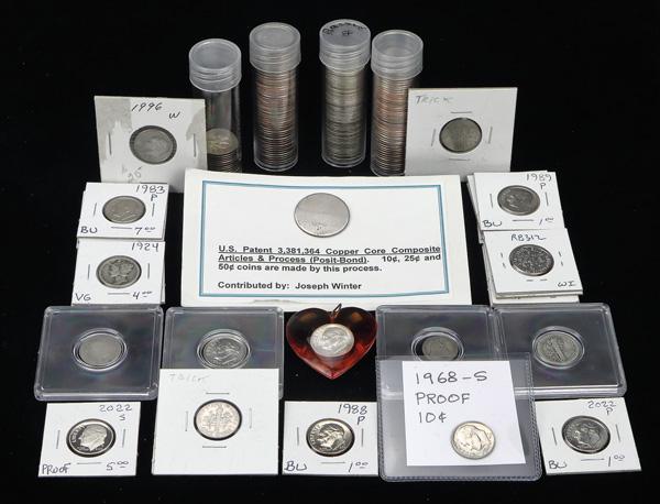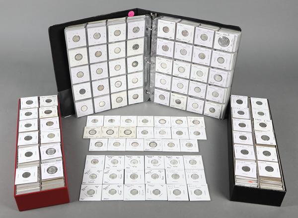 Large U.S. Roosevelt Dime Collection, 1946-2021, features stock book and reserve with over 850 dimes this impressive assortment with a significant amount of proofs; all coins in at least fine condition with a notable amount of silver content (850+). Shipping charges apply - weight 14.8 lbs. (Image)