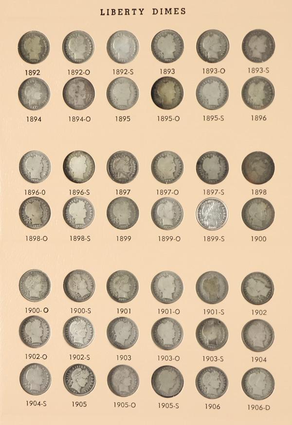 U.S. Complete Liberty "Barber" Dime Collection, 1892-1916, features $10.30 in silver face value, including a complete run of dates plus some duplicates housed in a Dansco album, and a few lower condition coins housed in a Whitman Album, the collection is highlighted by the key dates of 1892-S; 1895; 1895-O; 1896-O & S; 1897-O; 1903-S; 1913-S; almost all between Good to Choice VG; additional high grade coins include an 1899-S in XF-AU; with many others in VG to Choice Fine, please inspect; there are numerous coins that are difficult to find; a very nice old estate find. Shipping charges apply - weight 2.2 lbs. (PDF for this Lot) (Image)