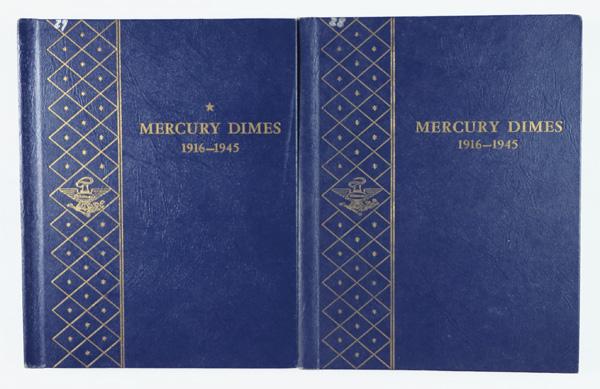 Collection of (148) 10C Mercury Dimes, 1916-1945, consists of (2) Whitman folders (74) dimes in each book; in the 1st book better dates include: 1921 Good-Fine, 1921-D Fine, 1926-S AG-Good, 1931-D F-VF; in the 2nd book better dates include: 1921 Fine, 1926-S Good, 1931-D Good-Fine; condition ranging from AG-XF; total face value of $14.80 in 90% silver; total of 148 dimes; please inspect (148). (PDF for this Lot) (Image)