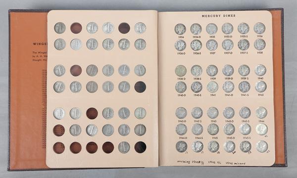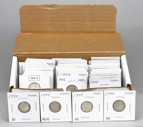 U.S. Collection of Mercury Dimes, 1916-1945, comprehensive and impressive, featuring a face value of $43.20 in 90% Silver alone; collection features one stock book and backup stock with many key mint marks and dates; an excellent buy for any reseller or serious collector. Shipping charges apply - weight 9 lbs. (Video for this lot) (Image)