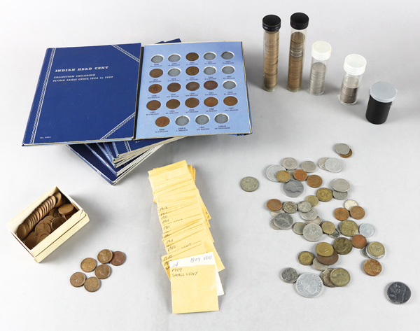 U.S. and Foreign. Wide-Ranging Collection of Coins, includes: (6) partially filled Whitman Coin Folders of Indian Head Cents with a 1857 Flying Eagle Cent, Lincoln Head Cents, Buffalo Nickels, Jefferson Nickels, & Roosevelt Dimes (10) American Revolution Bicentennial Medals (10) American Revolution Bicentennial Covers W/ Medals; an assortment of (100+) wheat cents; some nickels and quarters; plus some miscellaneous foreign coins & currency; please inspect. Shipping charges apply - weight 9 lbs. (Image)