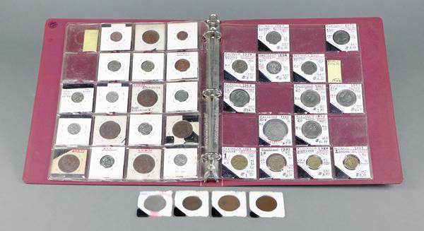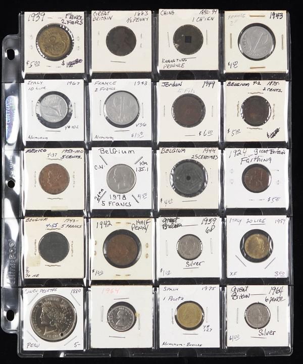 Worldwide Coin Collection, 1875-1998, a binder full of coins from over 30 countries, all in 2x2 flips with many interesting and desirable items; highlights include a Peru, 1880, 5 Pesos coin in VF-XF, with a small hole for jewelry; miscellaneous minors, mostly mid 1940 to 1960s, unsearched for varieties; also there are a few medals and tokens, mostly U.S. produced including 4 casino chips from Las Vegas; deserves a close look (120 coins). Shipping charges apply - weight 4 lbs. (Video for this lot) (Image)