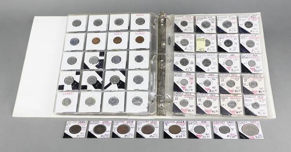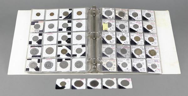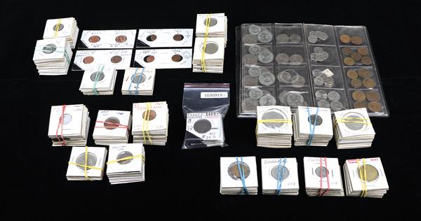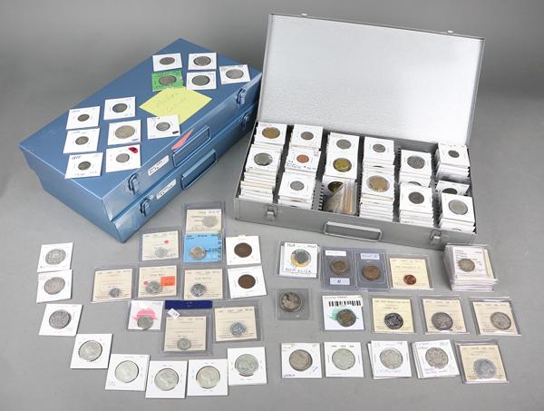 British America, Canada, New Brunswick and New Foundland Coin Collection, 1832-2013, lot of over 400 coins, all in 2x2 plastic or paper flips, includes another 20+ ICCS graded coins in plastic flips; highlights include an 1862, Nova Scvotia, 1 Cent, ICCS graded VF-20; a New Brunswick, 1854 Half Penny Currency token, in Chioice VF or better; New Brunswick, 1862, 10 Cents, ICCS F-15, and, 1864 Small 6, ICCS F-15; Newfoundland, 1888, ICCS graded VF-20; Nova Scotia, 1832 Half Penny; Bank of Upper Canada, Half Penny Token; Newfoundland includes ICCS graded 10 Cents, 1873, F-12, 50 Centas, 1880 and 1882-H, both F-12; Canada includes 5 Cent Silver ICCS graded 1902, VF-20 and 1910, VG-8; Canada, 25 Cents, 1880-H, VG (Mintage 400,000); Canada, 1872-H, ICCS gradd Fair, Inverted A/V; also icluded are ungraded halves, 1905, 1910 and 1920 between good to fine; additional ICCS graded Canada includes a 5 Cents 1896, VF-20; dimes include 1875-H VG-10; 1890-H EF-40; 1902 VF-30; 1909 VF-20; and Quarter, 1880-H, G-6; additional ICCS modern graded coins include a 1947, 1952 and 1953 quarters, all graded MS-63, and a few other graded coins; the balance of the coins are held in 3 metal cases and have a non-silver face value of over $120; please inspect, there are hundreds of coins that deserve a careful look; this lot is sure to include a number of surprises for the diligent collector or dealer (400+ coins). Shipping charges apply - weight 19 lbs. (Image)