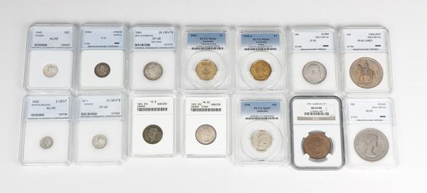 British Commonwealth, Canada, New Brunswick, Newfoundland, Great Britain and Australia Coin Collection, 1864-2000, lot of 14 Coins highlighted by a New Brunswick, 1864, 20 Cents, NNC XF-45 with note of an obverse nick; Newfoundland, 1938, 5 Cents Silver, AU-50; Canada, 1894, 25 Cents, ANACS VG 8; 1911, 10 Cents, XF-40; 1953, 25 Cents, MS 63 - Strap with nice toning; Great Britain features a 1959, 5 Shillings NNC PR-69 Cameo; a 1905 Florin, XF 40; Australia, 1918-M 6 Pence, NNC F-12; and 3 modern uncirculated Australian coins; attractive assortment (14). Shipping charges apply - weight 2 lbs. (Image)