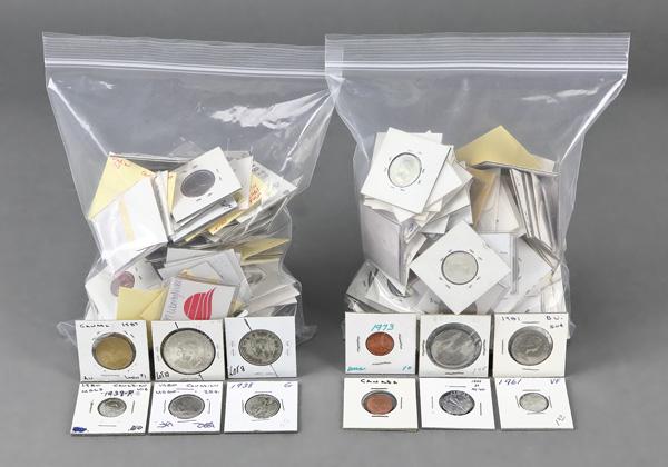 Canada, Amazing Assortment of Coins Including Some Silver In Different Denominations, mixture of coins in 2x2s and small coin envelopes; a group of the coins contain silver; ranging from 1¢-$1 CAD; please inspect; unsorted and not picked through; plenty of surprises to be found for the knowledgable collector; condition ranging from good to BU, some proofs included as well. Shipping charges apply - weight 5 lbs. (Image)