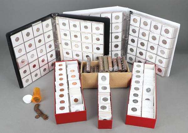 Canada, Extensive Coin Collection, 1922-2011, Canada coin collection featuring a wide variety of different issues in binders, boxes and rolls; there are over 800 coins in 2x2 flips mounted in binders and boxes, and 45 circulated rolls of modern Canada pennies (with possibly a few Uncirculated rolls) mostly post 1980; Nickels date from 1922 to 2011 with the later dates mostly Uncirculated (130+ coins); Canada, 1 cent, dating from 1921 to 2011, with the post 1960s including AU-Unc (150+); Canada 25 Cents dating from 2004 to 2013, most appear Uncirculated (50+); a white binder featuring modern quarters, $1, and $2 coins dating from the 1970s to 2015, circulated and Uncirculated (300+ coins with a FV of $161); a black binder of 85+ coins, dimes and quarters dating from 1939 to 2015, includes $2.40 FV of 80% silver. Interesting and worthwhile lot with hundreds of coins, the penny rolls completely unsearched, excellent lot for the beginning collector. (800+ coins in 2x2 flips and 1800+ pennies in rolls). Shipping charges apply - weight 35 lbs. (Image)