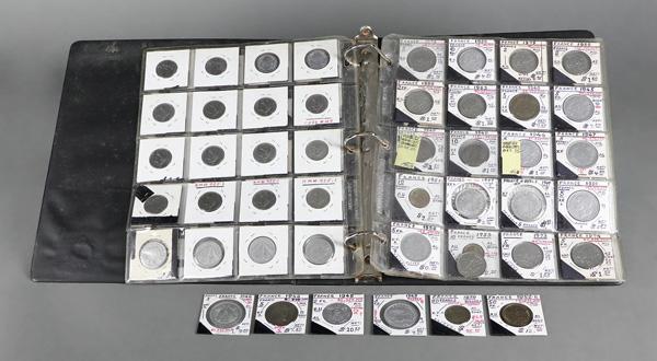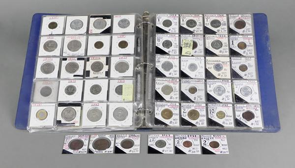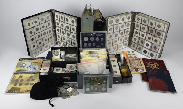 Worldwide Coin Collection in Binders, Rolls, Government Issued Sets and Miscellaneous, ca.1870-1980s, Lot of over 1200 coins in Binders, Rolls, Government Issued Sets and mixed rolls and envelopes, unsearched, Four 3-ring binders hold hundreds of coins in 2x2 flips, mainly minors with little silver, possibly a few better dates or types included, Highlights include a France, 1980 Specimen-Proof Set; Switzerland 1967 Mint Set; Thailand, 1963, 20 Baht Unc. coin; Newfoundland, 1885, 20 Cents, Fine; Boxes of loose coins in roll holders, includimng Thailand, 25 Satang, 1954-64 coins (approx 80 coins in Unc.); Canada, 1993, 25 Cents partial roll of 24 coins in XF to Unc.; 1930 to 1950s Canada pennies in 2x2 cardboard holders, and hundreds of other coins, worth a good look (1200+ Coins). Shipping charges apply - weight 50 lbs. (Image)